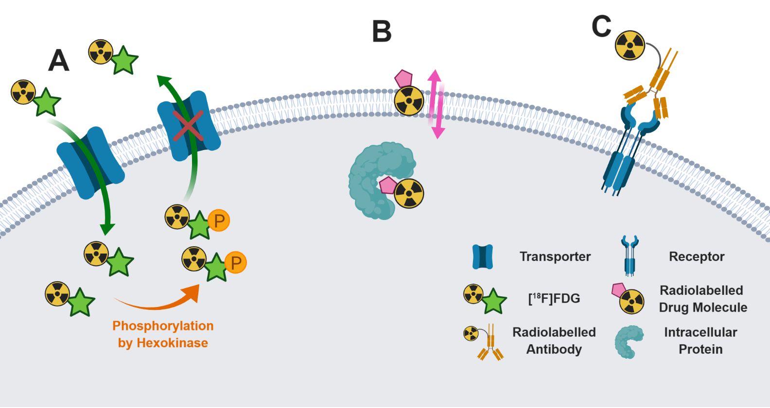 Figure 2. Different radiolabelled scaffolds and their applications. A) [18F]FDG is transported in to cells where it accumulates due to metabolic trapping subsequent to phosphorylation by hexokinase. B) A radiolabelled drug molecule crosses the cellular membrane and binds to its intracellular protein target. C) Radiolabelled antibodies bind to the extracellular domain of specific receptors.