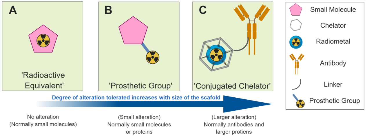 One approach is to produce a direct radioactive equivalent of your molecule of interest (Figure 3A). Advances in both radiochemistry and the robotic platforms used to perform the manipulations, have led to remarkable advances in our ability to incorporate radioactive atoms into structures of increasingly complexity. The radiolabelling can be performed using the radionuclide itself (e.g. fluorine-18 fluoride for fluorination) or by using radioactive reagents or building blocks (e.g. carbon-11 methyliodide for methylation) to synthesise the molecule. Alternatively, small molecules or peptides can have small radioactive units known as ‘prosthetic groups’ attached to them to facilitate radiolabelling where direct substitution of a non-radioactive atom for one that’s radioactive is not possible (Figure 3B). Larger species such as antibodies are amenable to more considerable alteration, whilst maintaining their original biological behaviour. This allows for functionalisation with larger structures such as chelators for coordinating radioactive metals including zirconium-89 or copper-64 (Figure 3C).